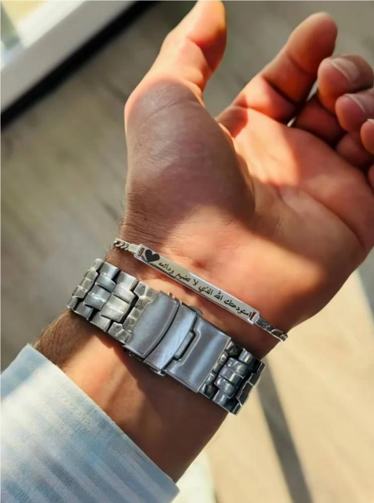 ارتق بإطلالتك بمعنى عميق مع هذه الأسوارة الرجالية الأنيقة، المصممة من الفضة اللامعة بنقش ليزري مميز يحمل عبارة